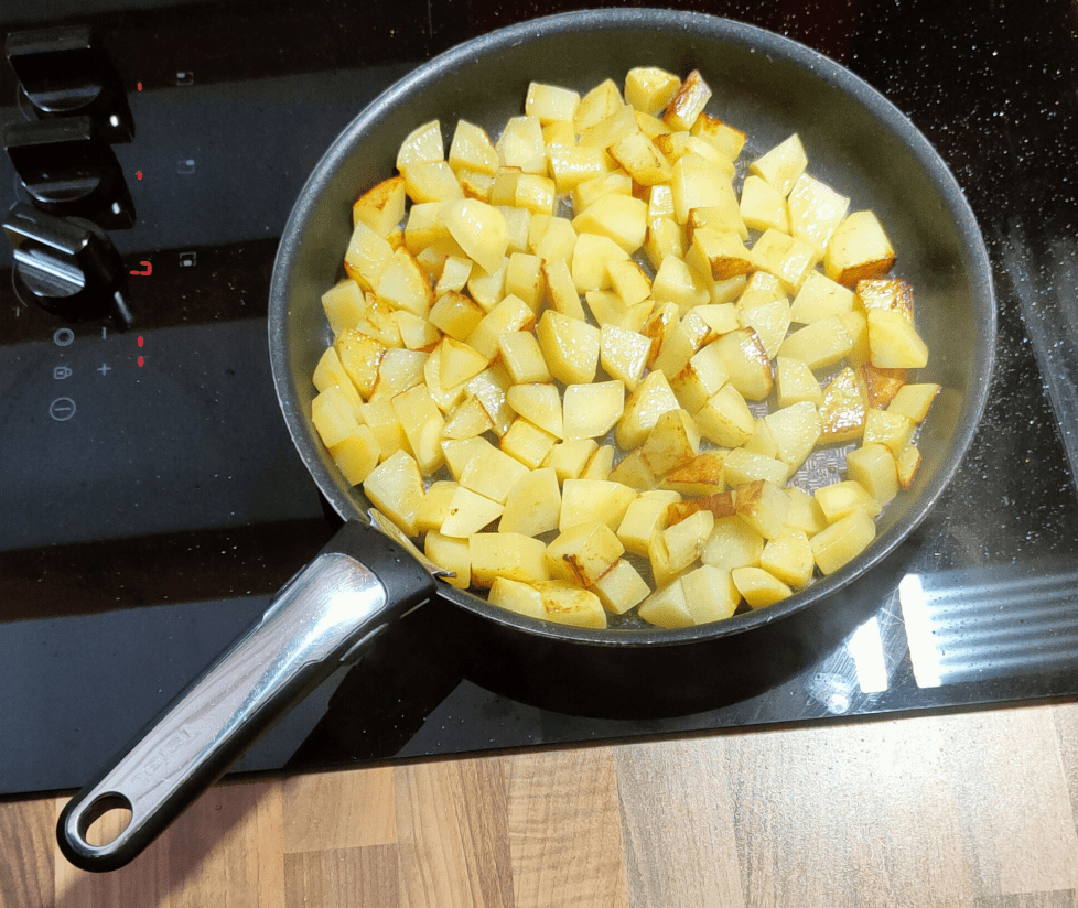 - On mélange les pommes de terres jusqu’à ce qu’elles soient bien colorées
